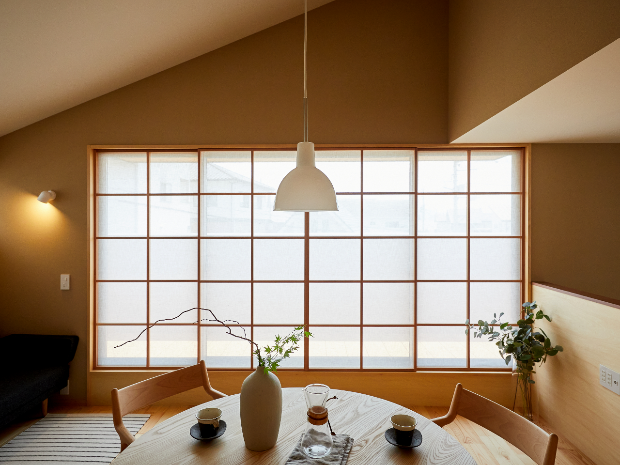 北側に位置するLDKには、大きな開口を設けることで、安定したやわらかな光を一日を通して取り入れることができます。 ダイニングキッチンは天井を低く抑えることで落ち着いた雰囲気を演出し、リビングは勾配天井にすることで視線が抜け、開放感と広がりを感じられる空間に仕上げました。 窓の外には季節を映す庭が広がり、暮らしの中に自然がやさしく溶け込みます。 また、読書を楽しんだり、お子さまの遊び場や昼寝スペースとしても活用できる「ヌック」、リビングと家庭菜園をつなぐ土間空間など、多目的に使える余白のある設計も魅力のひとつです。 生活のシーンに合わせて使い方を自由に変えられる、暮らしに寄り添う住まいとなりました。 【お電話でのお問い合わせ】 お電話の場合は10:00〜17:00(水曜定休)のご対応となります。 「家づくりの相談をしたいので予約したいのですが…」などとお伝えください。 📞089-951-4500