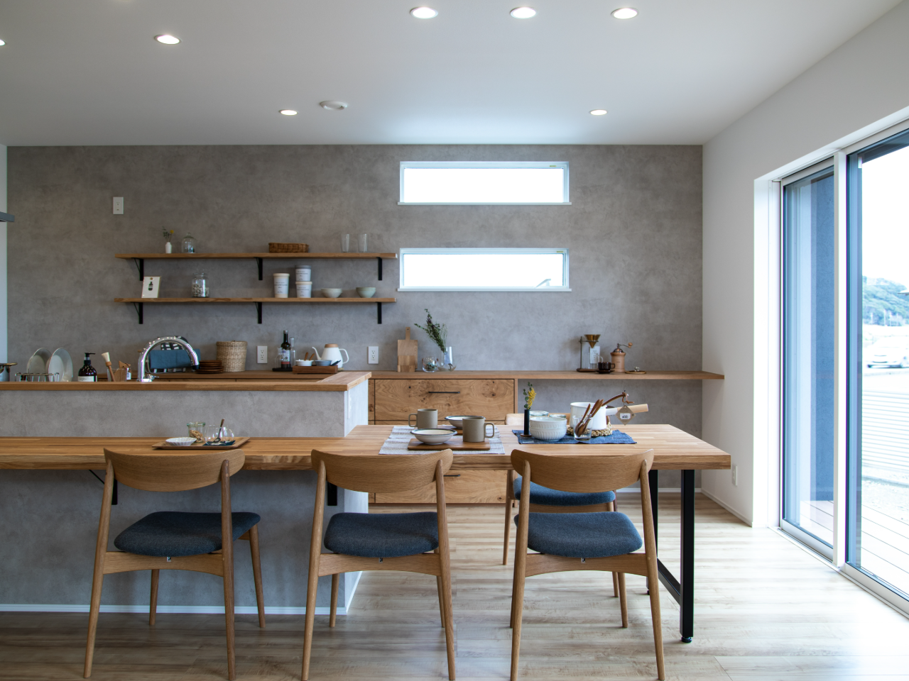LDK に足を踏み入れた瞬間、驚きと同時に羨ましさが訪れるはず。ワンフロアのオープンな空間の先には、海と空が広がります。 無垢の温かみとともに、溢れんばかりの開放感と爽やかさ。何よりも”見えない部分” に拘ったT様邸は、眺めはもちろん心地よさも抜群です。 抜群の景色を楽しむためにこだわったベランダの手摺や統一された建具の高さやデザイン、毎日の料理が楽しくなるようなキッチン収納など、お施主様のこだわりが随所に散りばめられ、心地よさへと繋がっています。 大切なのは”どんな暮らしがしたいのか”ということを住まい手と共に考え実現していくことだと教えてくれます。